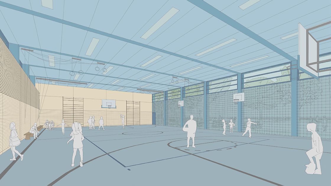 Im Rahmen der Studie haben wir unterschiedliche Optionen zur zeitgemässen Nutzung der Turnhalle im Hinblick auf die räumliche Funktion, die Ausstattung der Halle, die Barrierrefreiheit und die energetischen Gebäudehüllensanierung untersucht. Die Sporthalle in Grevenbroich soll weiterhin den Grundschülern und externen Vereinen zur Verfügung stehen.