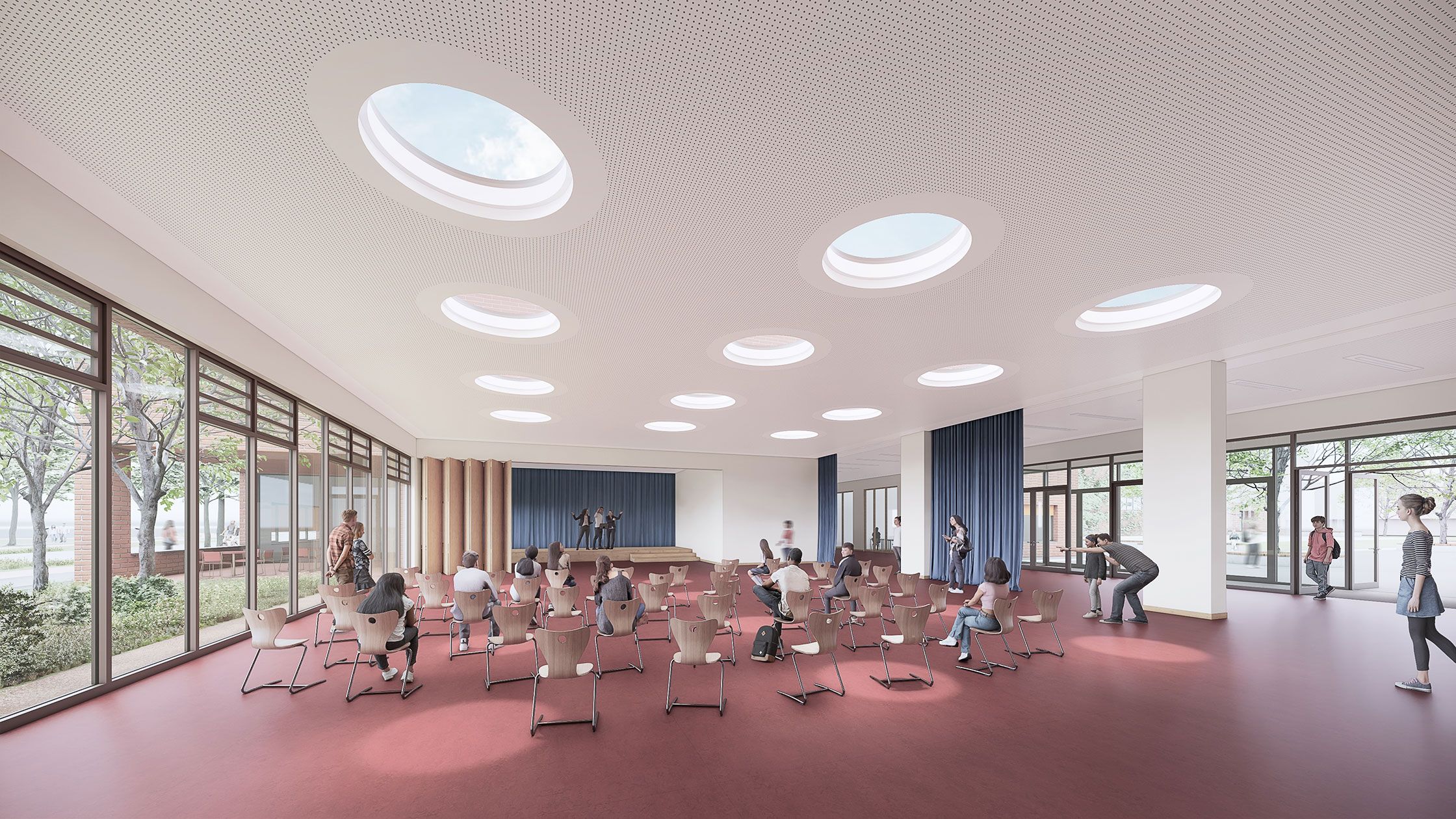 Die ersten Innenraumstudien gewähren Einblicke in die offenen und flexibel nutzbaren Lern- und Aufenthaltsräume der Nikolaus-Grundschule in Meerbusch.