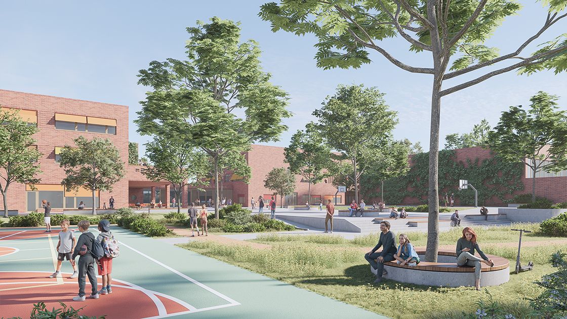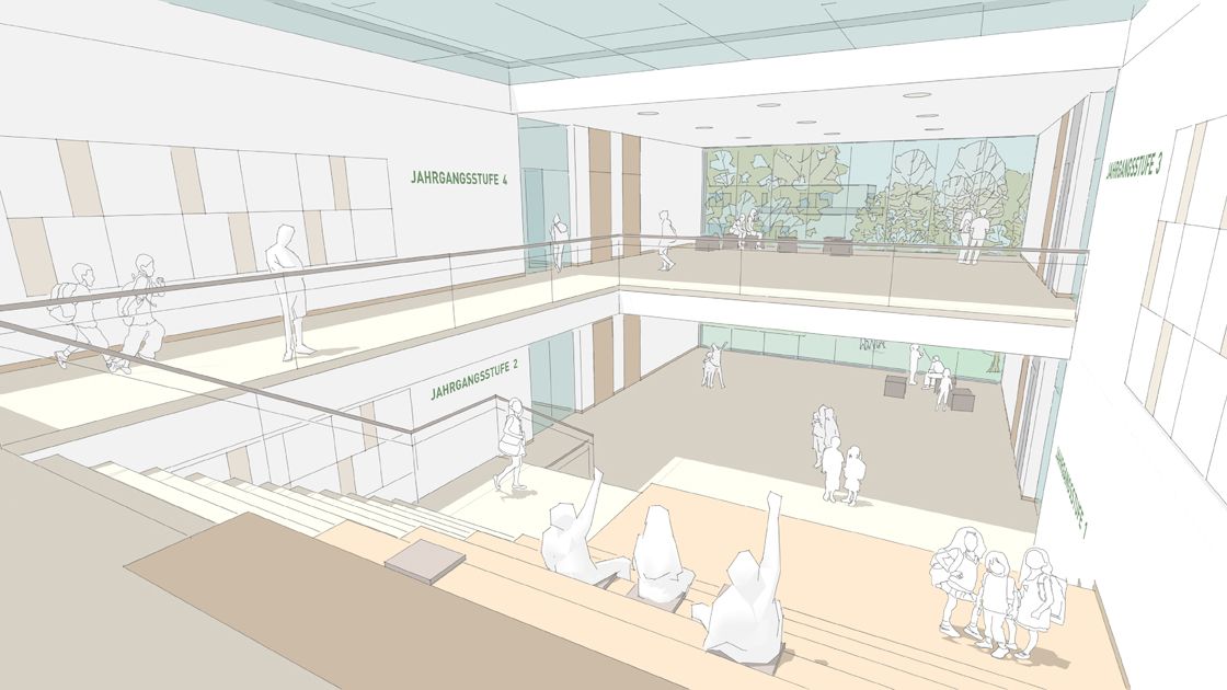 Die ersten Innenraumstudien gewähren Einblicke in die offenen und flexibel nutzbaren Lern- und Aufenthaltsräume der Nikolaus-Grundschule in Meerbusch.
