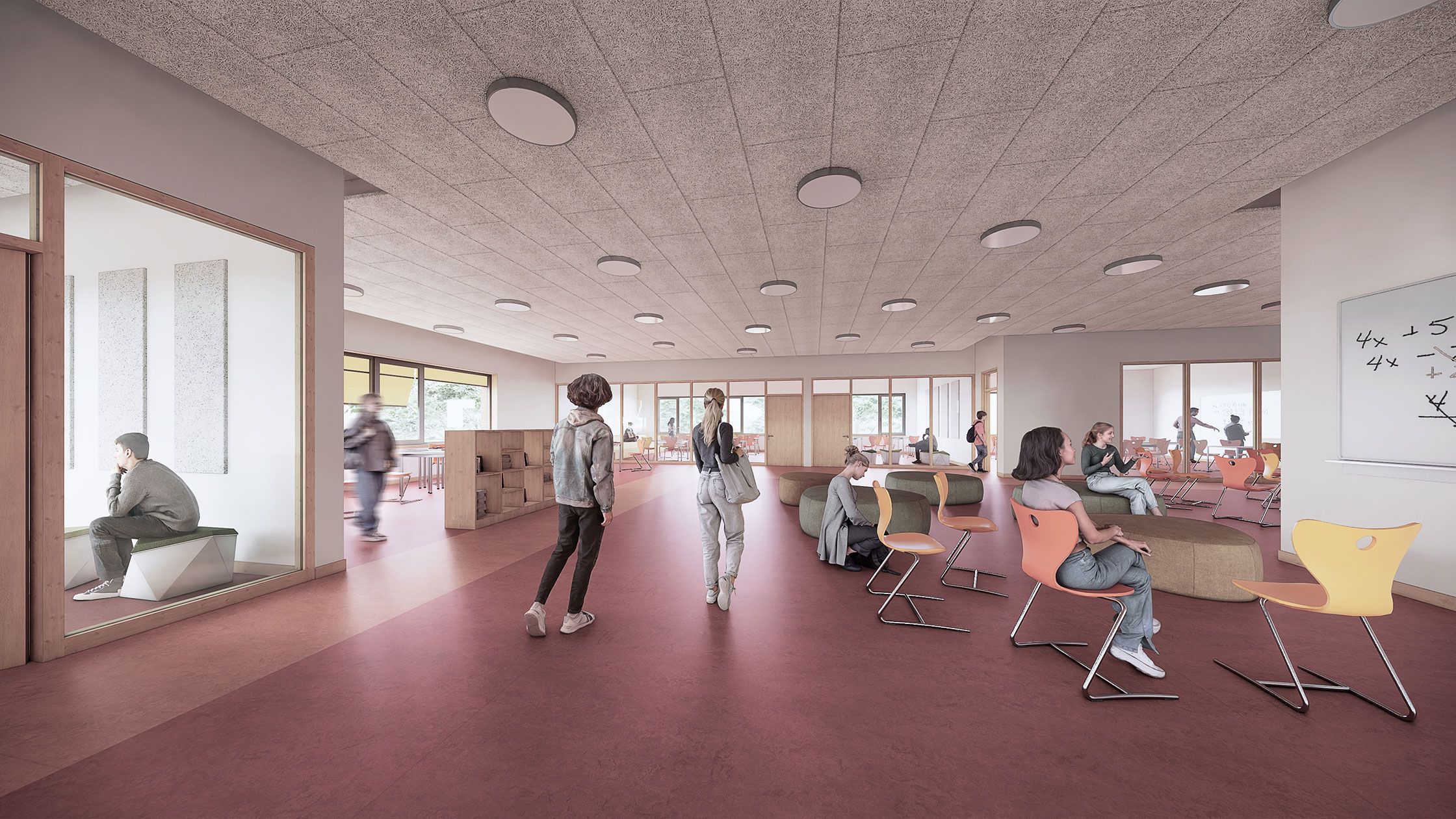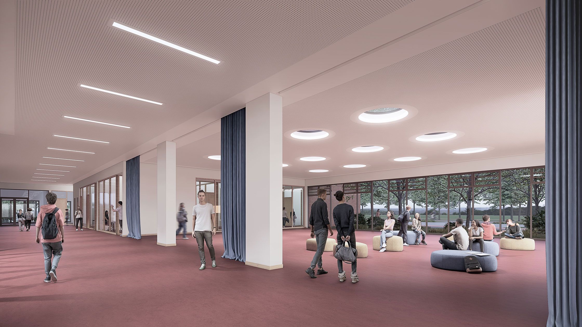 Um den Aspekten der Nachhaltigkeit - CO2-Bilanzierung in Errichtung und Betrieb mit Blick auf die angestrebte QNG-Zertifizierung - nachzukommen ist das Schulgebäude als Hybridkonstruktion mit hohem Holzanteil geplant. Die erdberührte Bodenplatte sowie die lastabtragenden Treppenraumkerne - der Aussteifung dienend - sind in Stahlbetonbauweise, die Deckenkonstruktion sowie die tragenden Wände in Holzbauweise ausgeführt.