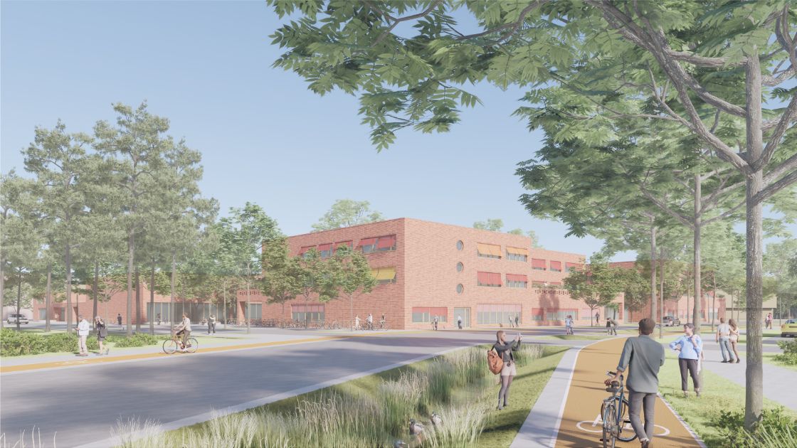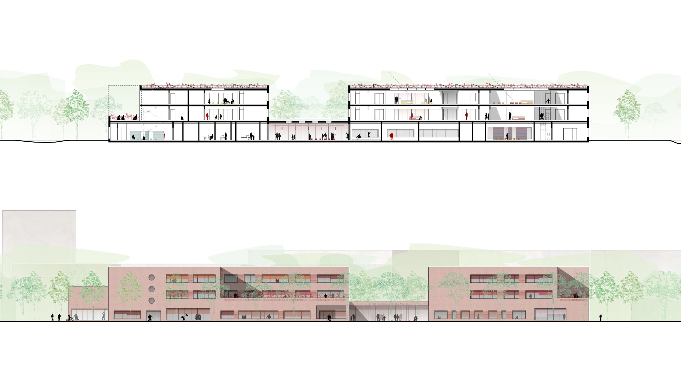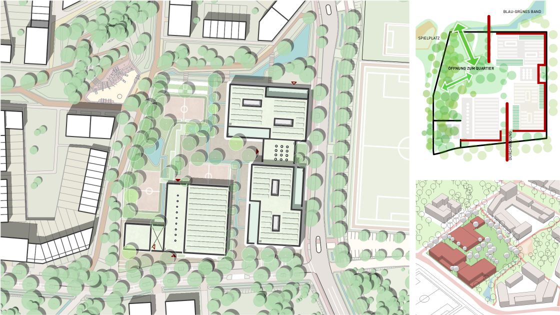 Durch die Positionierung der Baukörper wird es gleichermaßen ermöglicht, dass der Schulhof von Norden und Süden erschlossen werden kann und dass sich dieser in Richtung des Blau-Grünen Bandes samt Steilhangspielplatz öffnet unter Einbeziehung des westlich gelegenen vorhandenen Biotops der Kiefernwälder, welches auch zukünftig von Hochbauten freigehalten wird.