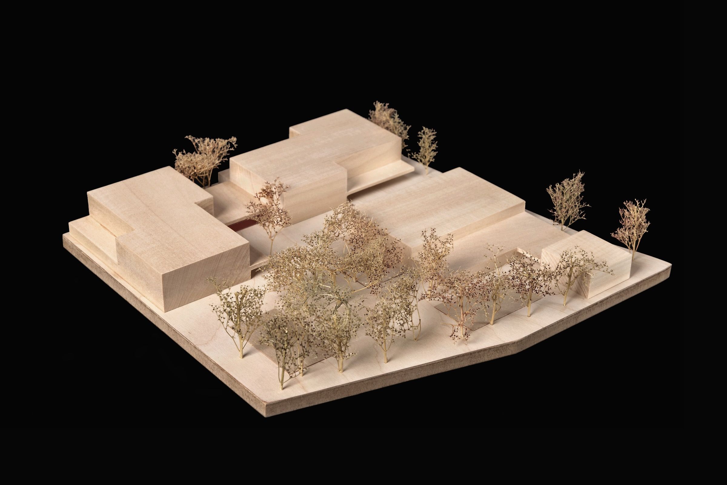 Der Baukörper verfügt über zwei gut proportionierte Gebäudeteile mit einem zwischengelagerten Foyer. Letzteres ist schlüssig dem Eingang gegenüber angeordnet, ohne dabei jedoch zur Verkehrsfläche zu werden. Besonders hervorgehoben wird vom Preisgericht die Anordnung der Bühne mit rückwärtigem Zugang. Wertgeschätzt werden auch die überdachten Außenbereiche.