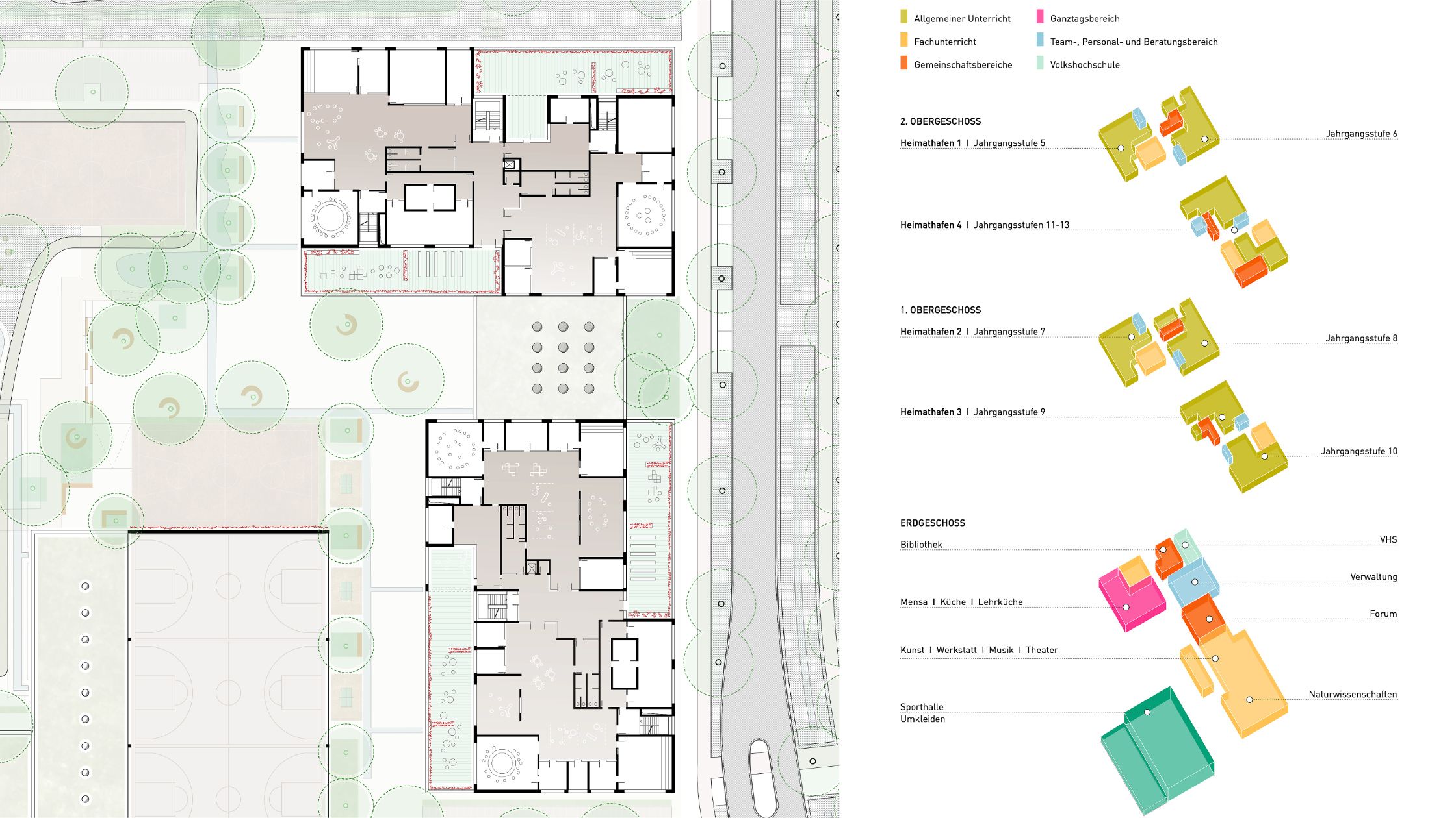 Das Gebäudeensemble aus Schulgebäude - zwei "Heimathafenhäuser" mit einer verbindenden Erdgeschosszone - und Turnhalle mit westlich anschließendem Haus der Jugend markiert den südöstlichen Auftakt des neuen Stadtquartiers In den Reethen und definiert die angrenzenden Straßenräume grundstücksbegleitend. Die Höhen- und Gebäudevolumenausbildung der kompakten Baukörper bezieht sich in ihrer Maßstäblichkeit auf die zukünftig entstehenden Baufelder.