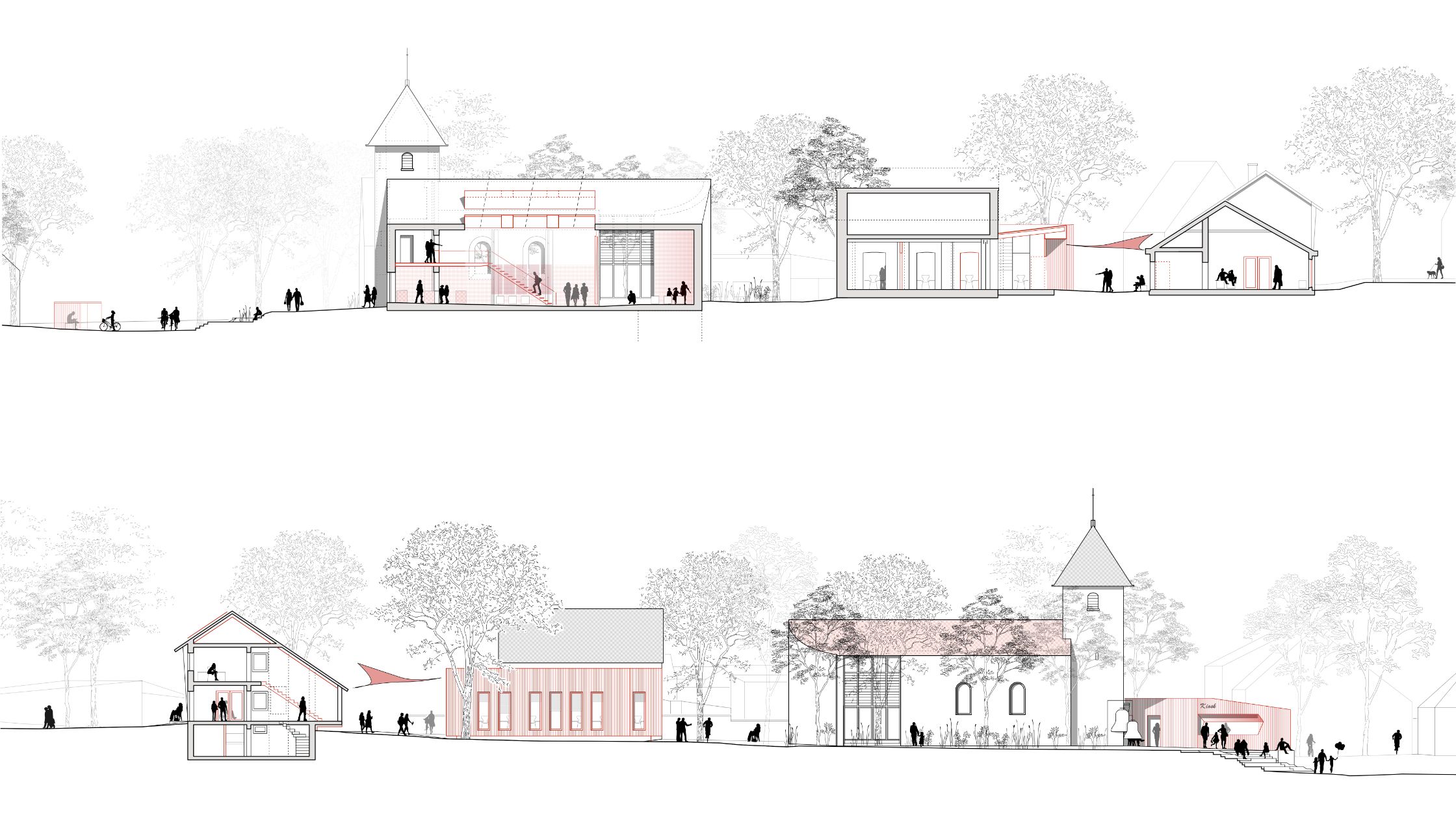 Die Zonierung des Grundstücks erfolgt im Einklang mit den Nutzungen. Im Norden des Grundstücks befinden sich die öffentlichen Funktionen rund um das neue Café an der alten Friedhofsmauer, den Kiosk mit Ausrichtung zum Dorfplatz und zum ehemaligen Haupteingang der Kirche sowie die offene Halle der ehemaligen Lambertus-Kirche. Südlich daran schließen zunächst Arbeits- und Aktivitätsbereiche für Bewohnende und Besucher*innen sowie Ausstellungs- und Werkräume mit angebundenem Werkhof an. Sie grenzen an den im Süden gelegenen großen Dorfgarten mit geschütztem Baumbestand. Dieser steht allen Bürgern*innen für Aktivitäten mit Spiel- Begegnungs- und Ruhebereichen zur Verfügung. Ein wesentliches Entwurfsmotiv zeigt die Verknüpfung des topografisch erhöhtem Grundstücks im Norden mittels einer großzügigen Freitreppen- und Rampenanlage mit Sitzstufen mit dem zukünftigen Dorfplatz, der als verkehrsberuhigte Zone den Auftakt für den gemeinschaftlichen Ort der Zukunft bildet.