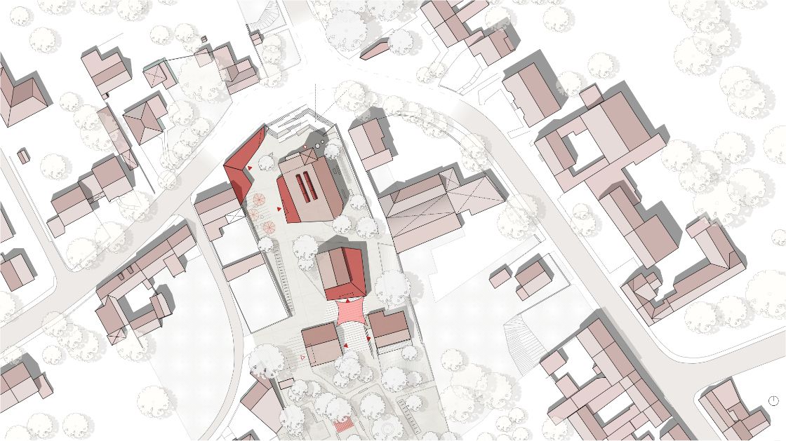 Die Zonierung des Grundstücks erfolgt im Einklang mit den Nutzungen. Im Norden des Grundstücks befinden sich die öffentlichen Funktionen rund um das neue Café an der alten Friedhofsmauer, den Kiosk mit Ausrichtung zum Dorfplatz und zum ehemaligen Haupteingang der Kirche sowie die offene Halle der ehemaligen Lambertus-Kirche. Südlich daran schließen zunächst Arbeits- und Aktivitätsbereiche für Bewohnende und Besucher*innen sowie Ausstellungs- und Werkräume mit angebundenem Werkhof an. Sie grenzen an den im Süden gelegenen großen Dorfgarten mit geschütztem Baumbestand. Dieser steht allen Bürgern*innen für Aktivitäten mit Spiel- Begegnungs- und Ruhebereichen zur Verfügung. Ein wesentliches Entwurfsmotiv zeigt die Verknüpfung des topografisch erhöhtem Grundstücks im Norden mittels einer großzügigen Freitreppen- und Rampenanlage mit Sitzstufen mit dem zukünftigen Dorfplatz, der als verkehrsberuhigte Zone den Auftakt für den gemeinschaftlichen Ort der Zukunft bildet.